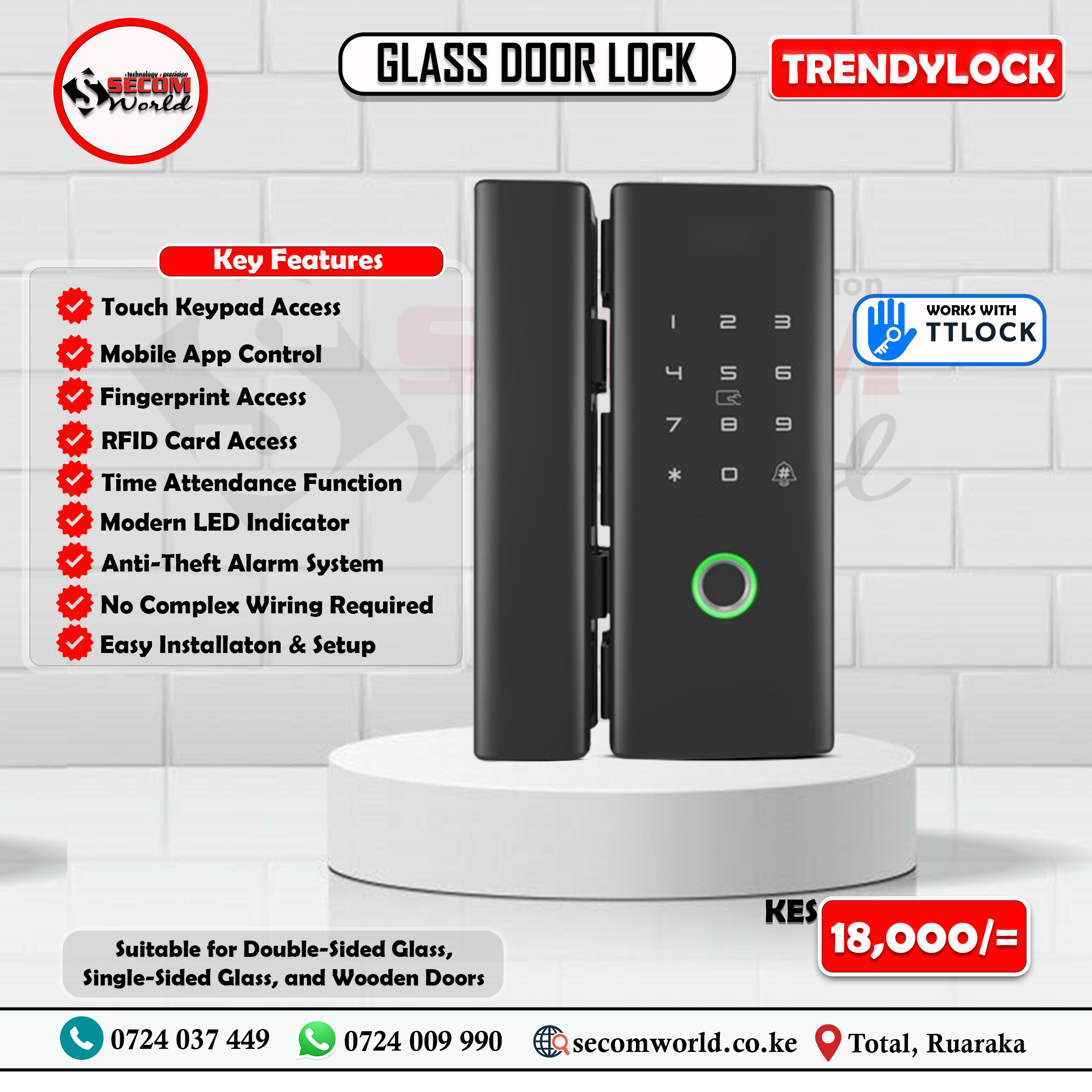 The TRENDYLOCK Glass Door Lock is built with high-quality materials to ensure durability and reliable performance. Its sleek and minimalistic design blends seamlessly with any décor, making it an ideal choice for residential and commercial use.