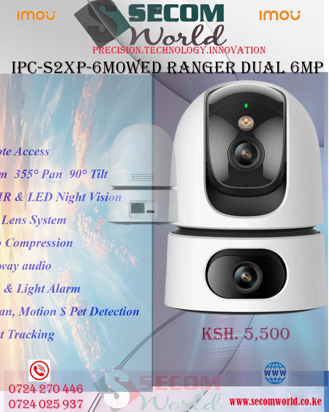 The Imou IPC‑S2XP‑6M0WED (also known as Ranger Dual 6MP) is a dual‑lens 6 MP indoor Wi‑Fi pan‑tilt camera that delivers broad, intelligent surveillance coverage with advanced AI capabilities. Featuring two 3 MP sensors (total 6 MP) and H.265 video compression, it captures sharp, high‑quality video at 2304×1296 resolution with efficient bandwidth and storage use.