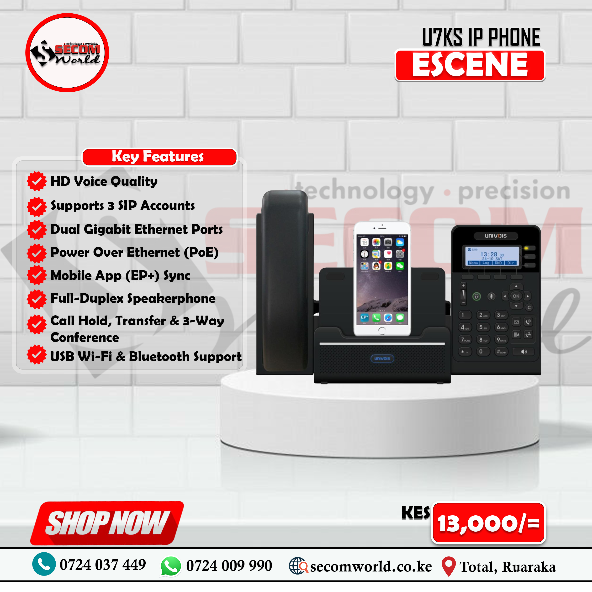 A feature-rich IP desk phone with HD voice, Bluetooth 4.0, dual Gigabit Ethernet with PoE, and mobile phone integration. Designed for modern offices, it supports up to 3 SIP accounts, 3-way conferencing, USB expansion, and seamless interaction with Android and iOS smartphones.